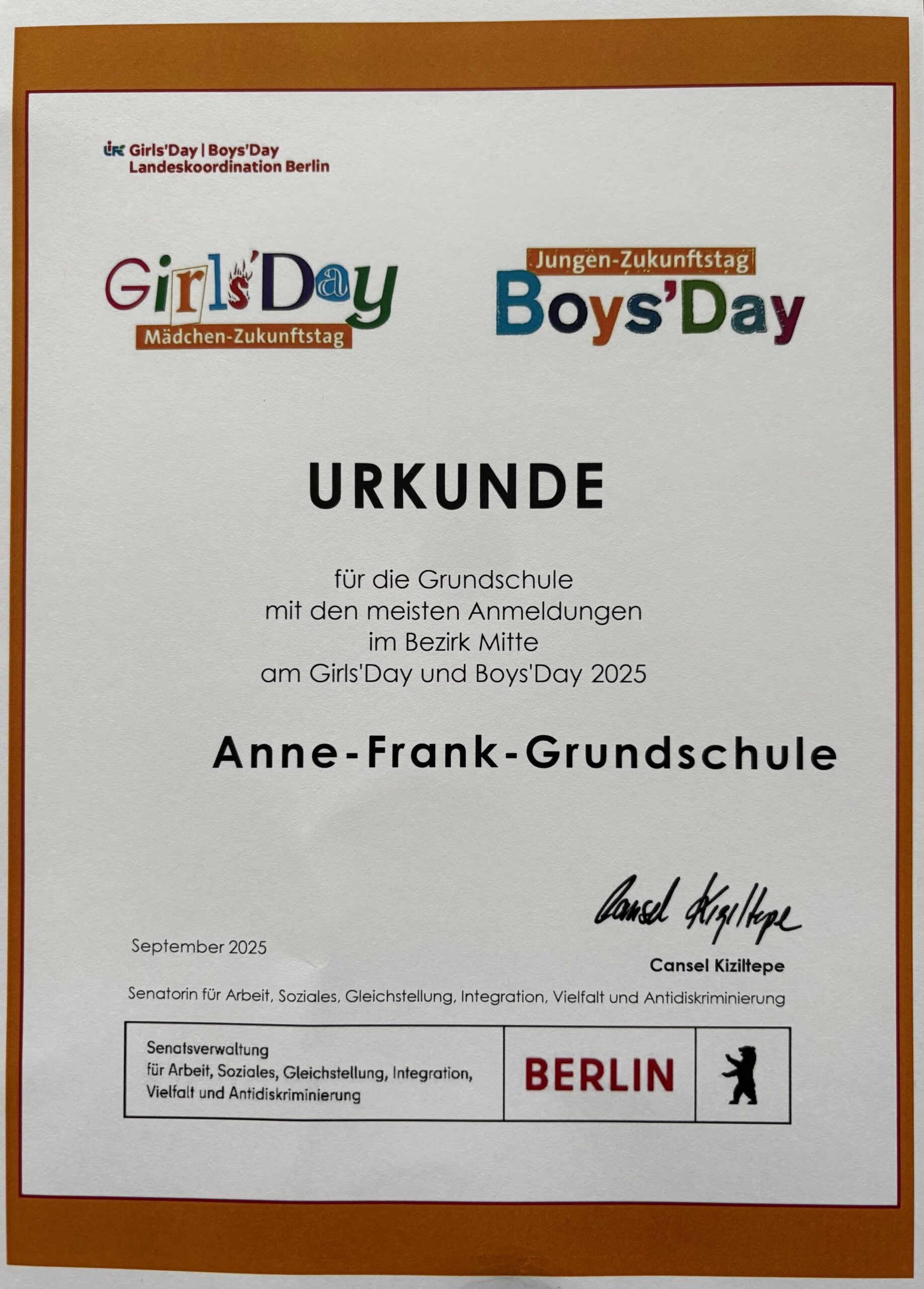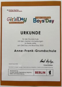 Rekord! Unsere Schule stellt in Mitte die meisten Teilnehmer:innen beim Girls‘ & Boys‘ Day – danke an alle Kinder, Eltern und Kolleg:innen. Wir bleiben dran: Der nächste bundesweite Aktionstag findet am Donnerstag, 23. April 2026, statt. Damit alle Wunschplätze klappen, bitten wir die Eltern: Jetzt schon nach passenden Angeboten suchen, Plätze reservieren und ggf. Arbeitgeber anschreiben. Tipp: girls-day.de und boys-day.de regelmäßig checken; viele Plätze gehen ab Januar/Februar online und sind schnell vergeben. Formulare der Schule folgen rechtzeitig.