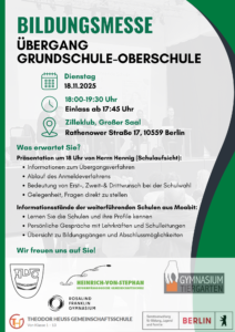 Am 18.11.2025, um 18.00 Uhr findet im Zilleklub, Rathenower Straße 17 die Moabiter Bildungsmesse für die Elternschaft der umliegenden Grundschulen statt, die sich zum Thema Übergang in die Oberschule informieren möchten. PrevNext